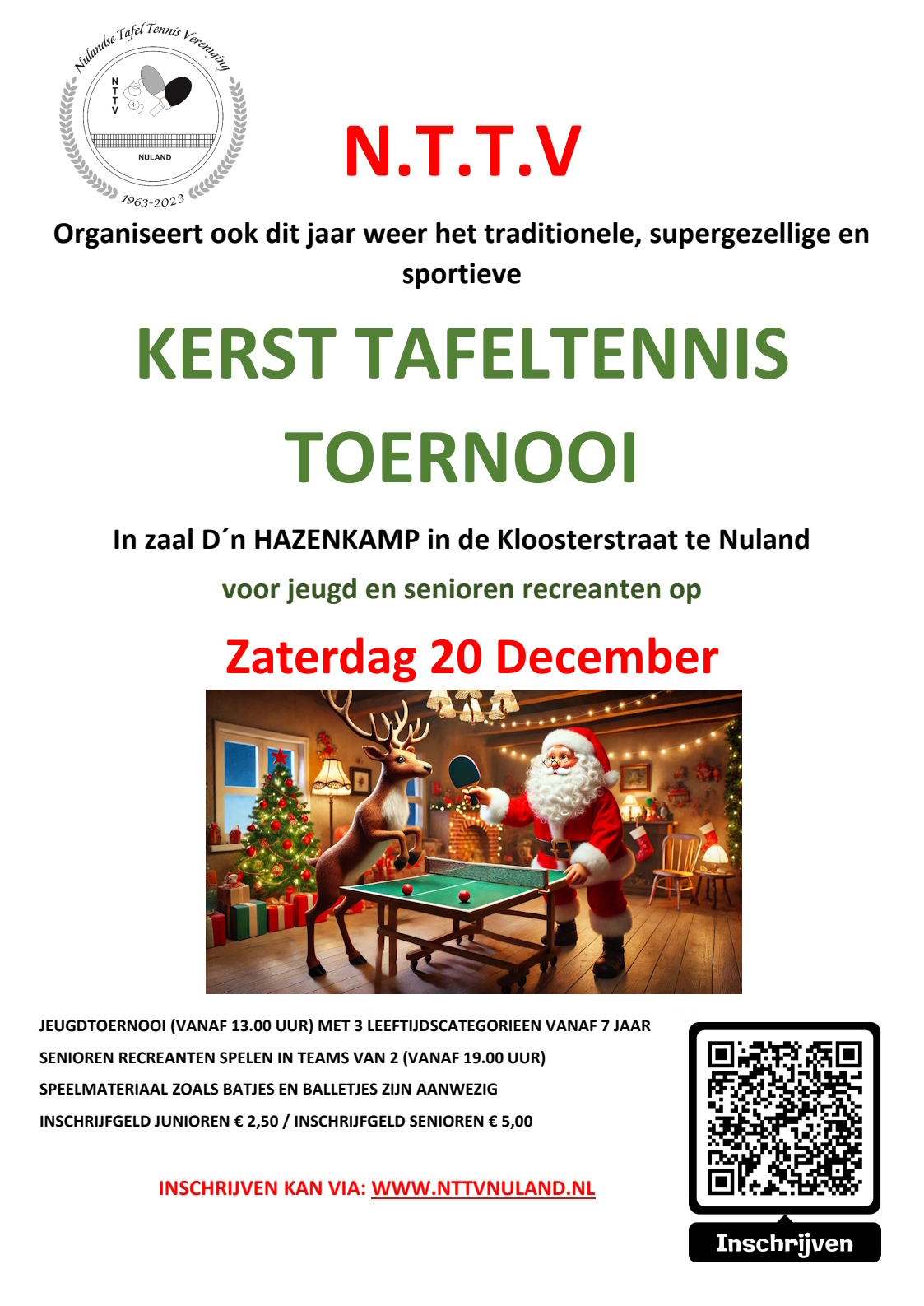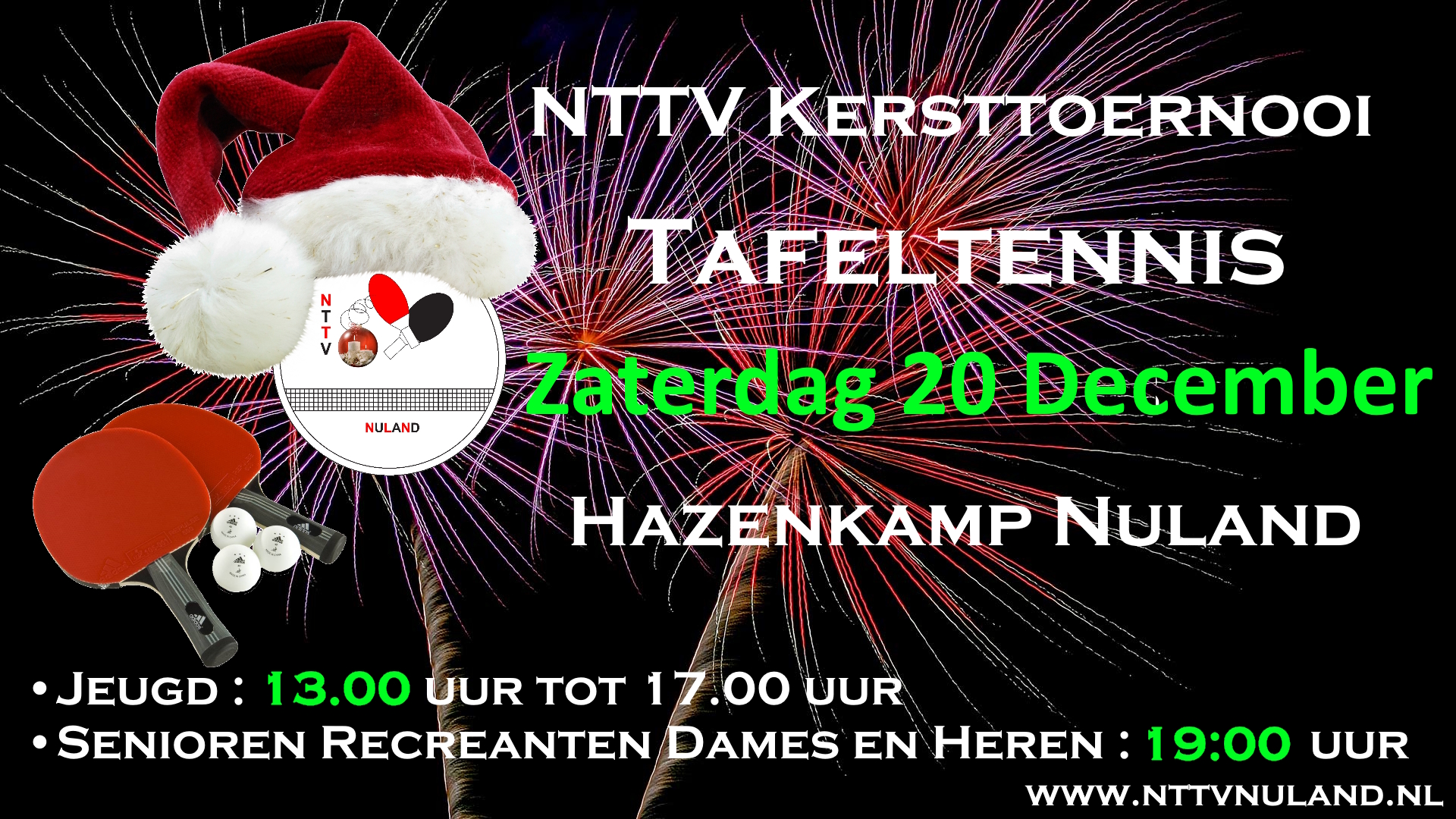 Op zaterdag 20 december 2025 a.s. wordt in zaal D’n Hazenkamp te Nuland wederom het traditionele Kerst Tafeltennistoernooi gehouden.Zowel de jeugd als volwassenen zijn van harte welkom om sportief naar het einde van het jaar te gaan. Speelmateriaal zoals batjes en balletjes zijn aanwezig. Het jeugdtoernooi (jongens en meisjes) is ‘s middags van 13.00 tot circa 17.00 uur.Het seniorentoernooi (dames en heren) begint om 19.00 uur, dit zal een toernooi zijn met teams van 2 […]
